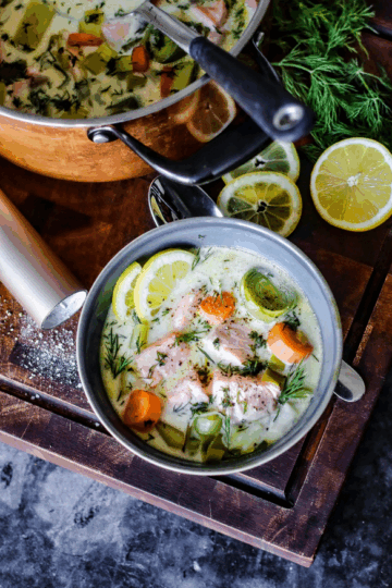 Kartoffeln und Möhren schälen und kleinschneiden. Porree säubern und in Ringe schneiden. In einem großen Topf die Butter schmelzen und darin Porree, Möhren und Kartoffeln anschwitzen. Würzen und mit dem Fond ablöschen. Bei geschlossenem Deckel auf kleiner Stufe köcheln lassen, bis die Kartoffeln weich sind. Währenddessen den Fisch in mundgerechte Stücke schneiden und den Dill […]