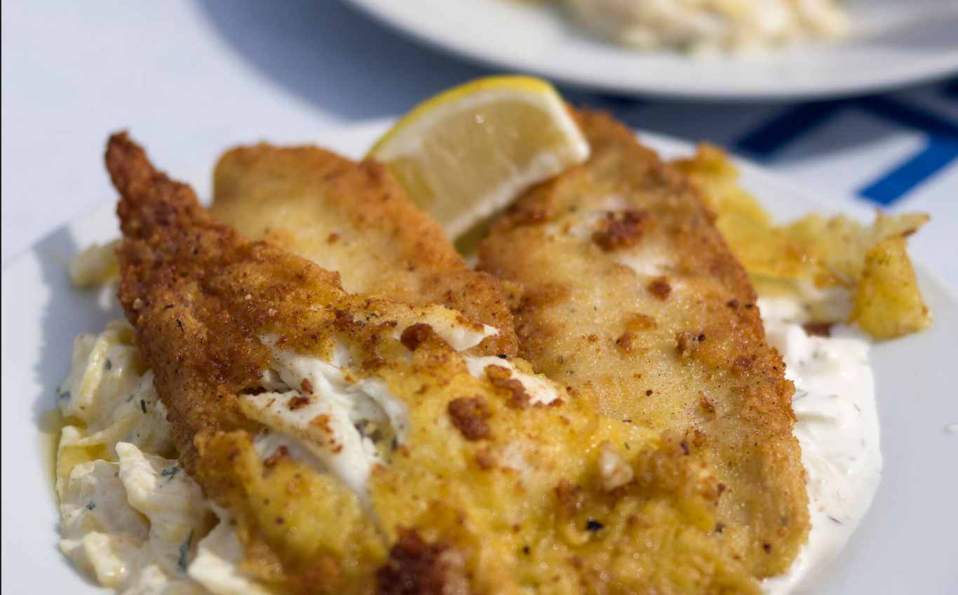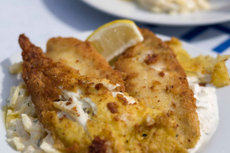 Fischfilets in Mehl wenden, überschüssiges abklopfen und durch den Bierteig ziehen.