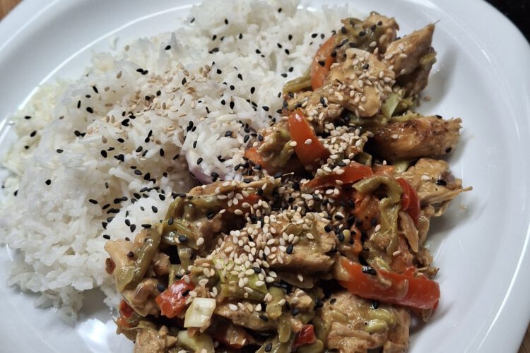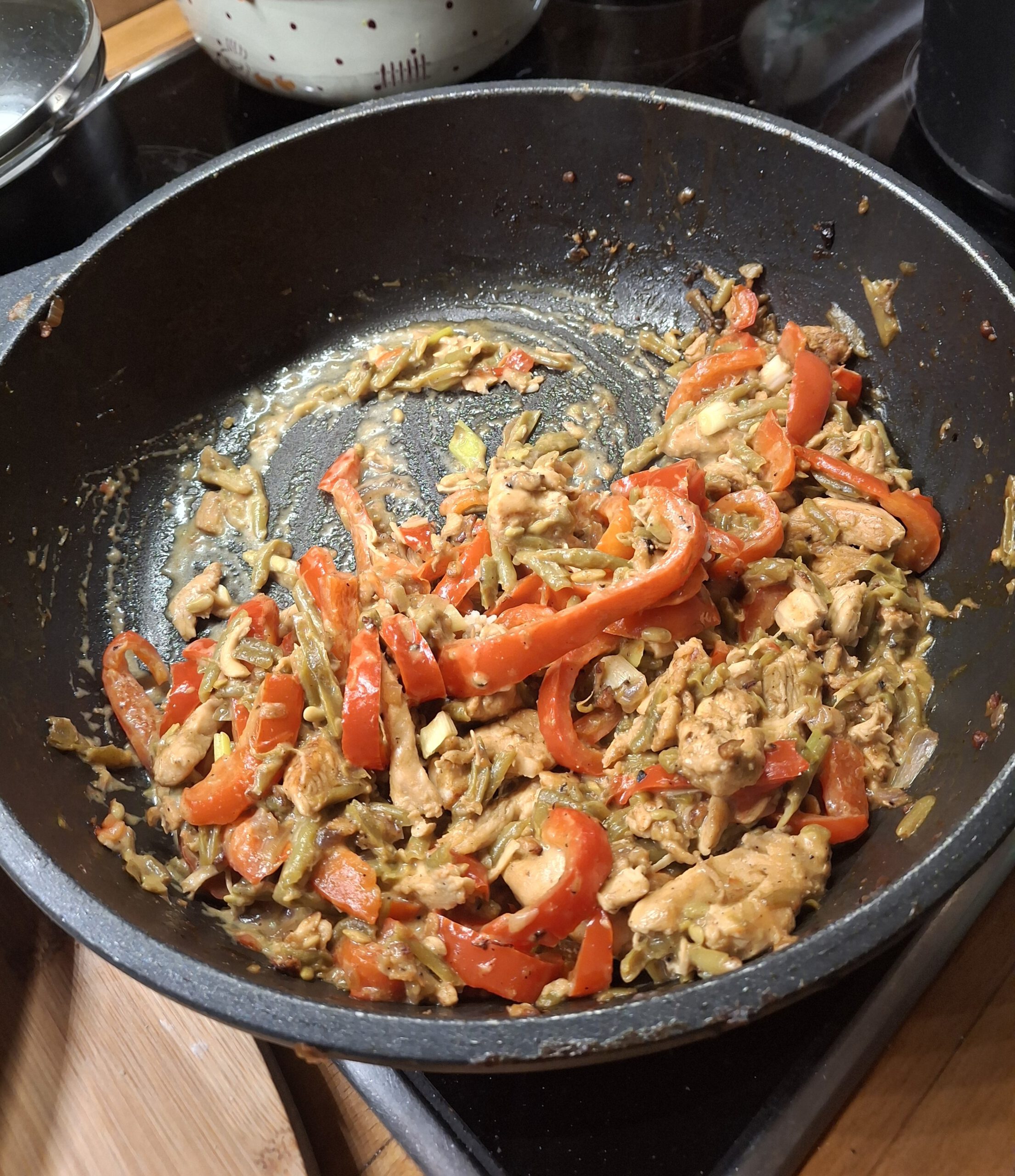 Hähnchen waschen, und in Streifen schneiden. Die Bohnen in einen Topf geben und mit Wasser bedecken. Bohnen für 8 – 10 Minuten bissfest kochen, dann im Sieb abtropfen lassen.