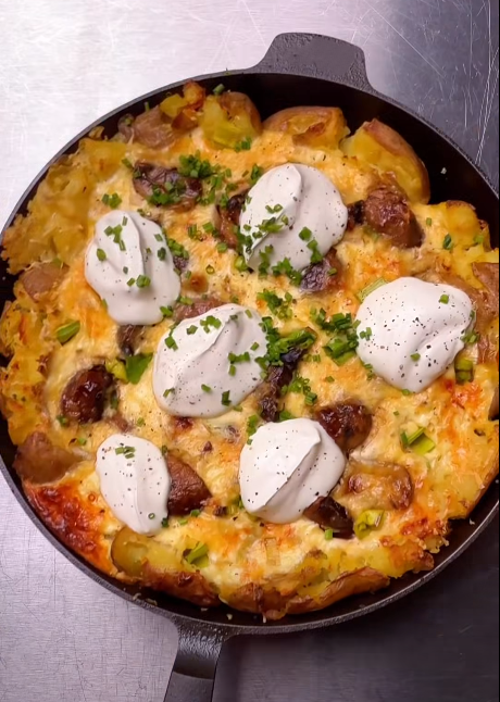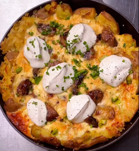 Im vorgeheizten Ofen bei 180 °C Ober-/Unterhitze etwa 40–45 Minuten backen, bis die Oberfläche goldbraun und knusprig ist. Mit dem restlichen Schmand und frisch geschnittenem Schnittlauch servieren.