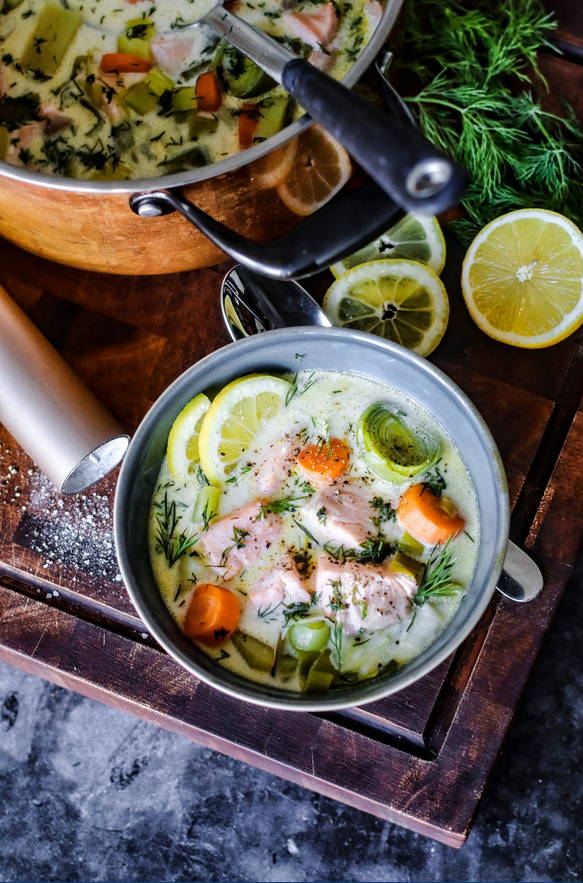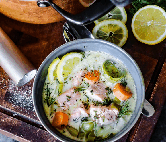 Vorm Servieren den gehackten Dill über den Eintopf streuen und mit ein paar Zitronenscheiben servieren.