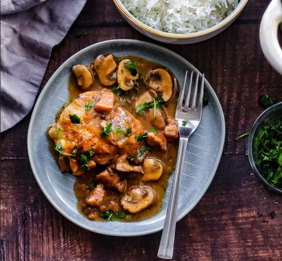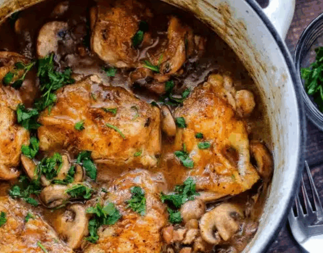 Mit Fond und Sahne ablöschen, den Zitronensaft zufügen, das Fleisch mit der Hautseite nach oben zurückgeben und alles auf kleiner Stufe etwa 10 Minuten einköcheln lassen. Falls es zu sehr eindickt, gern noch Flüssigkeit nachgeben.
