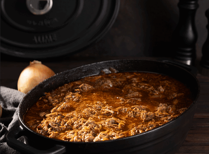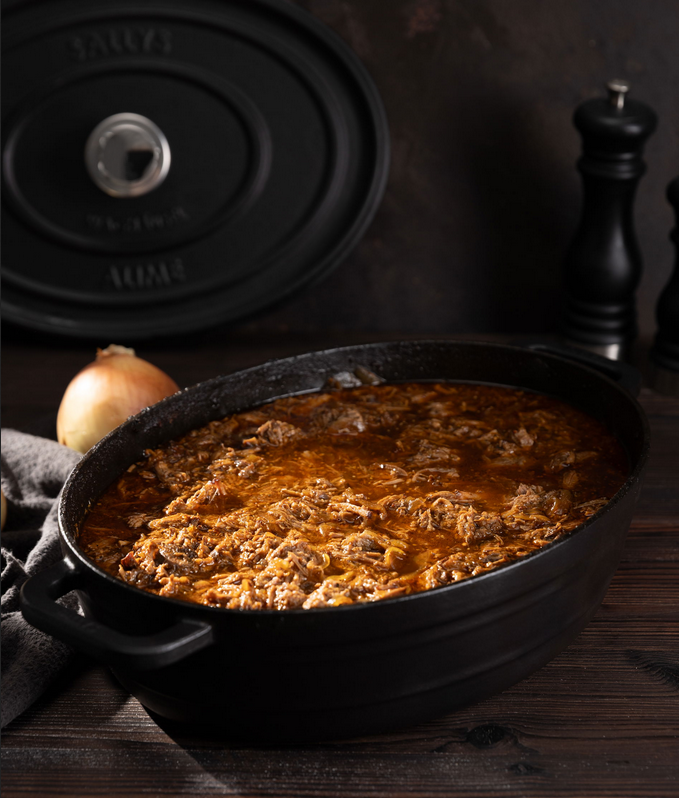 Verschließe den Topf und gare den Braten im vorgeheizten Ofen bei 120 °C O/U etwa 6-8 Stunden. Schalte den Ofen aus und lasse den Braten darin abkühlen.