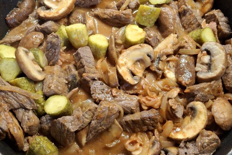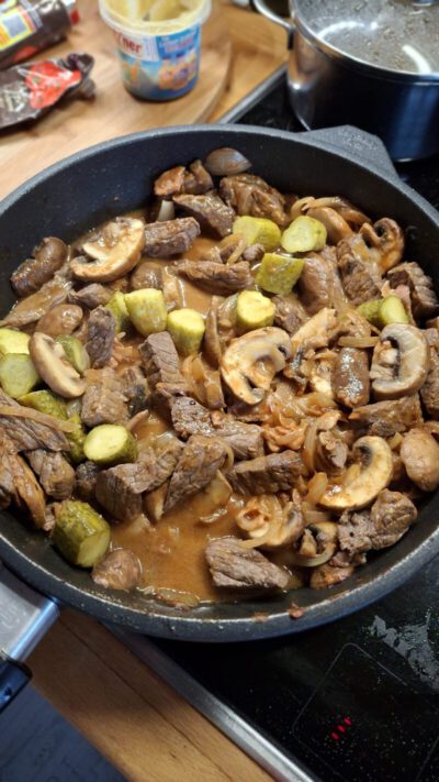 Tomatenmark und Senf unterrühren und kurz mitrösten. Das angebratene Fleisch wieder zurück in den Topf geben und mit Brühe auffüllen. Die Gewürzgurken grob würfeln und dazugeben. Mit Paprikapulver, Salz und Pfeffer würzen und mit geschlossenem Deckel bei kleiner Temperatur ca. 3 Stunden bei 160°C im Ofen schmoren, bis das Fleisch zart ist.